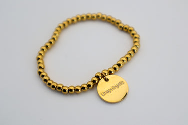Bold beads. Brushed gold. A nameplate that says it all—Unapologetic. This bracelet is your permission to take up space and be fully, fearlessly you.